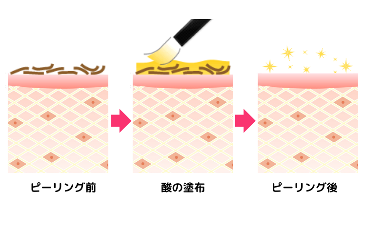 ピーリングは、酸性の薬剤を皮膚に塗布することで、古くなった角質層を化学的に溶解・除去する仕組みで作用します。