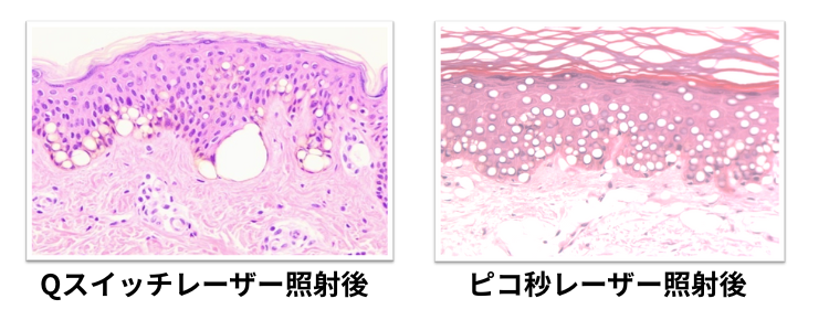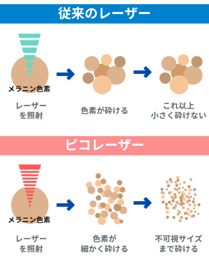 一方、ピコレーザーは単一波長のレーザーをピコ秒という超短時間で照射するため、メラニン色素をより効率的に粉砕できます。