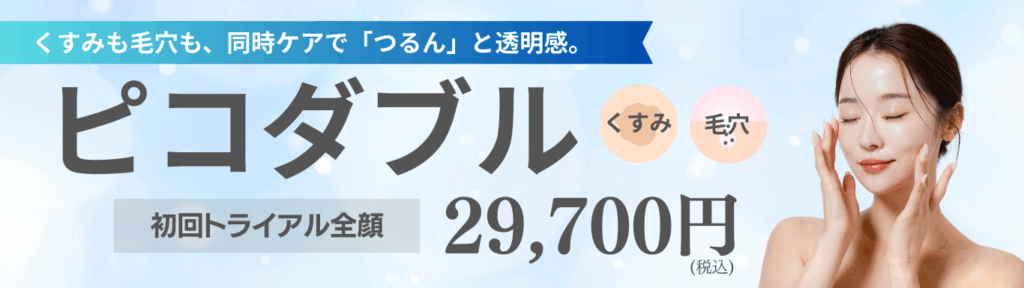 ピコスポットで濃いシミをピンポイントで除去し、ピコトーニングで肝斑やくすみを改善、ピコダブルでハリと透明感を同時に手に入れる。