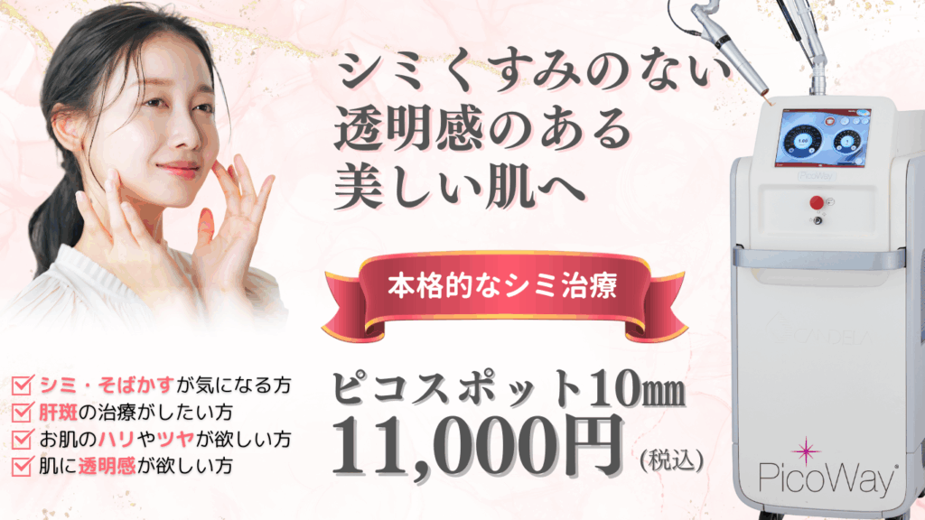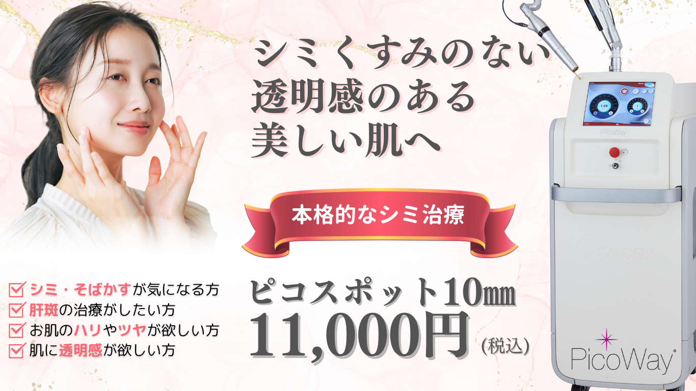 ピコスポットは、気になるシミやそばかす、ADM(後天性真皮メラノサイトーシス)に対してピンポイントでピコレーザーを照射するシミ取り治療法です。